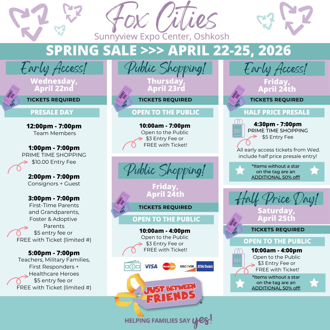 Shopping retail means hours in a mall with bored, crying kids—spending way more than you planned. And garage sales or social media buying can be disappointing and frustrating when items or connections aren't what you hoped they'd be. Shop Just Between Friends pop-up sales to save hundreds of dollars on new and gently-used clothes, toys, shoes, books and gear for all sizes—infant to teen, plus maternity—all in one place. Items are inspected for quality and safety which means great items at huge savings. You get stylish, confident, good-looking kids while saving money and time. That's smart!
